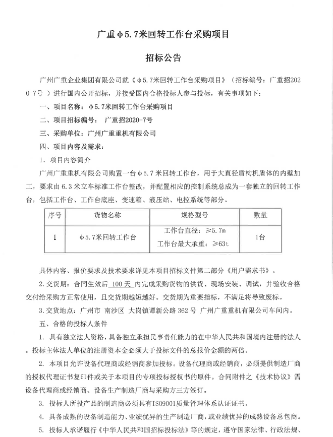 开云链接入口站官网_开云(中国)集团φ5.7米回转工作台采购项目